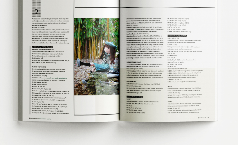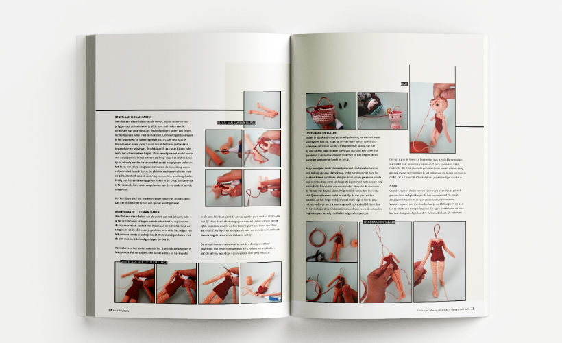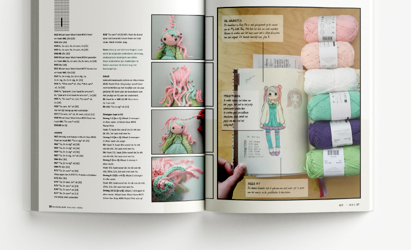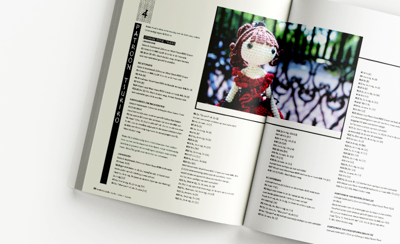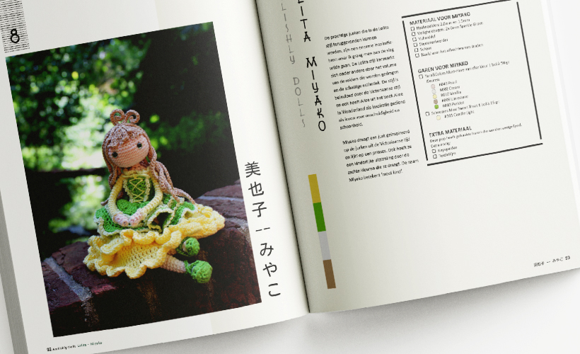 Amilishly Dolls: dit is alweer het zesde boek van Livres de Louise waar wij de vormgeving voor mochten doen. Omdat het haakpatronen zijn van Japanse figuren leek het ons leuk om de cover van het boek om te draaien. Net zoals bij de Japanse Manga stripboeken, die worden ook van achteren naar voren gelezen. Omdat het achterstevoren lezen van een haakpatroon toch wat lastiger is hebben we alleen de cover omgedraaid. Daarnaast zit er ook nog een mooie banderol om het boek heen om het net wat extra’s te geven. De illustraties en foto’s zijn door Alexa zelf gemaakt.