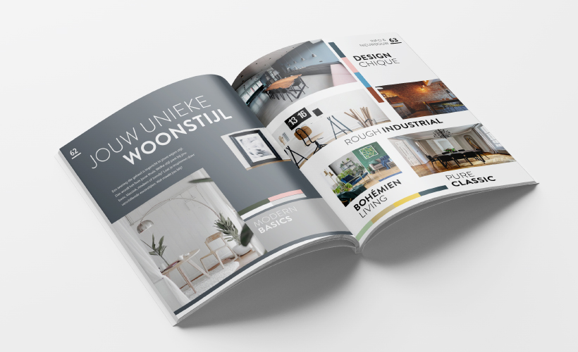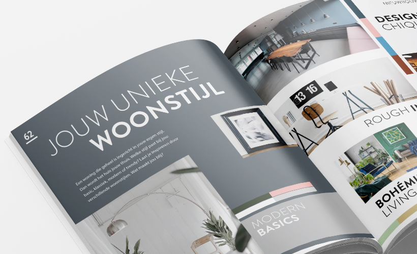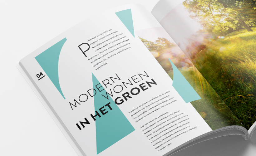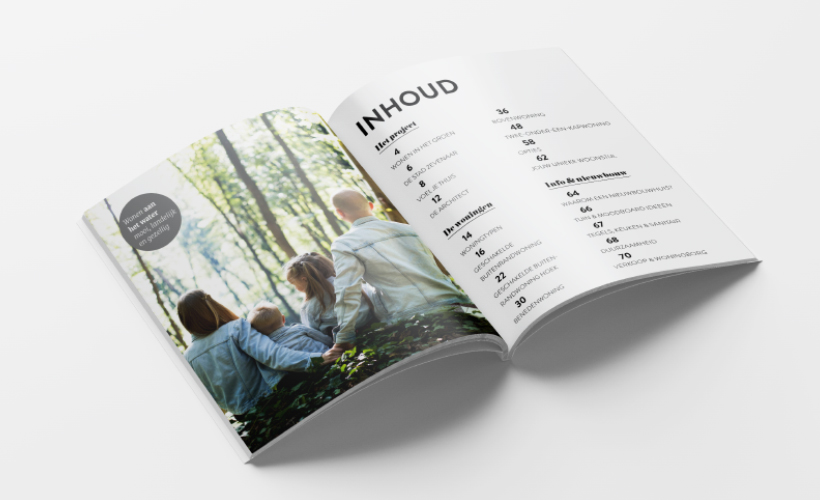 In plaats van een verkoopbrochure hebben wij er een mooi glossy magazine van gemaakt. Parkstede is een wijk met veel groen en water, dus een wijk met uitstraling. En die uitstraling zie je ook in het magazine terug. Naast de nodige informatie over de woningen staat er ook een interview in met de architect, informatie over de stad Zevenaar en een moodboard over verschillende interieur stijlen. Het is een glossy magazine geworden met een hoog bewaar gehalte.